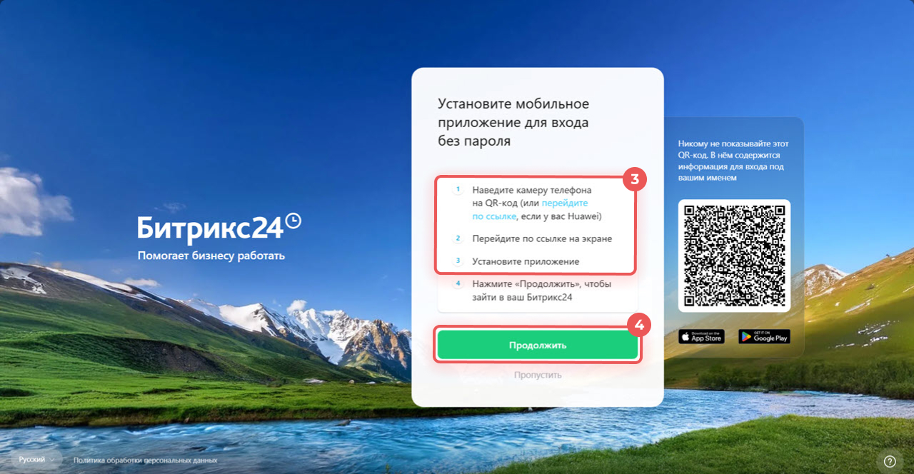 3–4. Установите мобильное приложение и нажмите Продолжить. Это поможет работать в Битрикс24 с телефона — ставить задачи, отвечать на сообщения, получать уведомления и так далее.