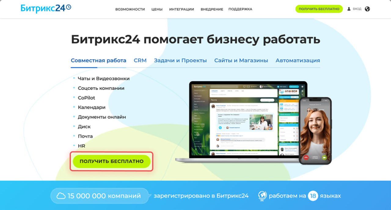 Перейдите на сайт Битрикс24 и нажмите Получить бесплатно.